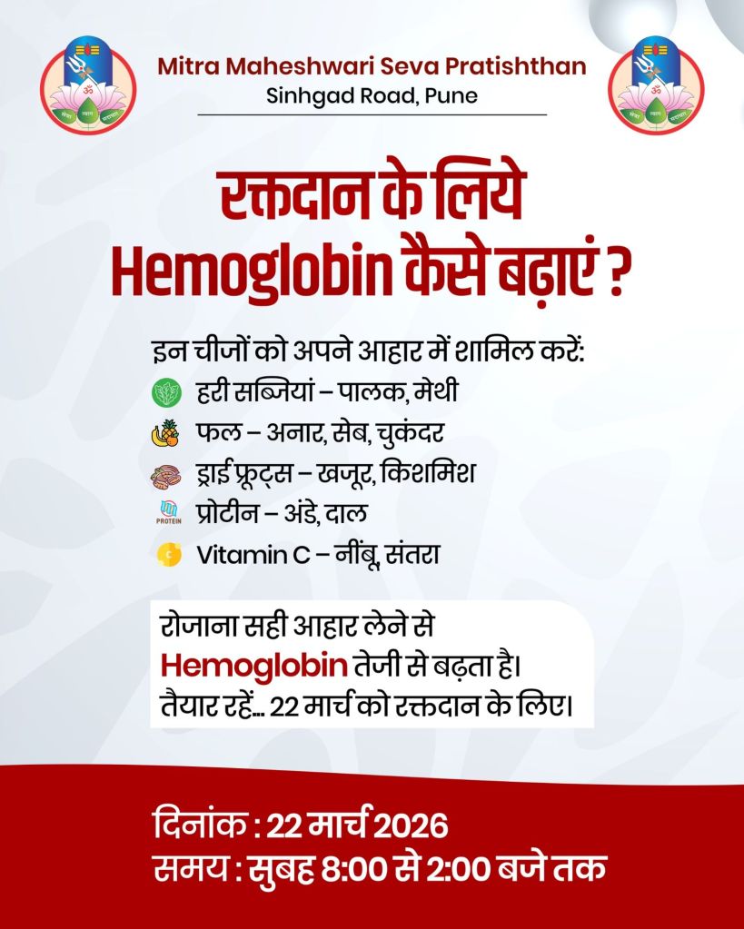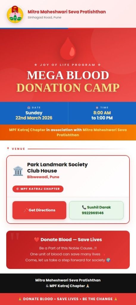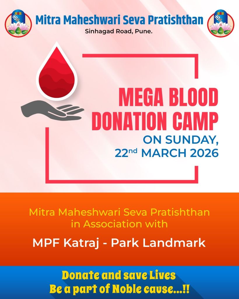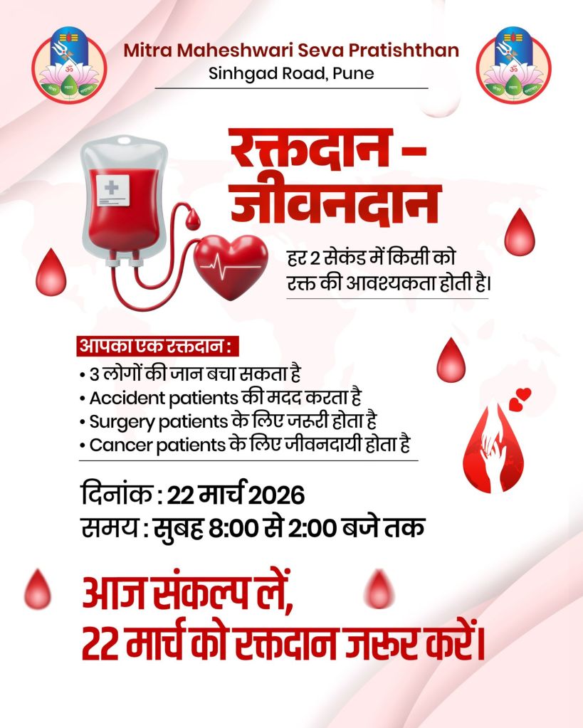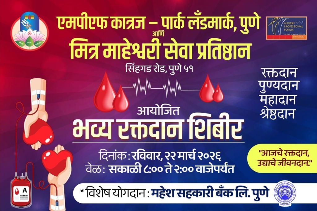 Mitra Maheshwari Seva Pratishthan has been organizing blood donation camps in the Sinhagad Road area for the past 26 years, and approximately 7,000 units of blood have been collected so far. Through this initiative, driven by social awareness, free blood has been made available to many patients.