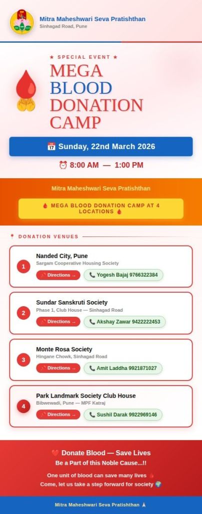On the occasion of its 27th year, a blood donation camp is being organized at 4 locations on Sinhagad Road on Sunday, 22nd March 2026 โ all on the same day. You can visit any convenient location (mentioned above) near you and donate blood.